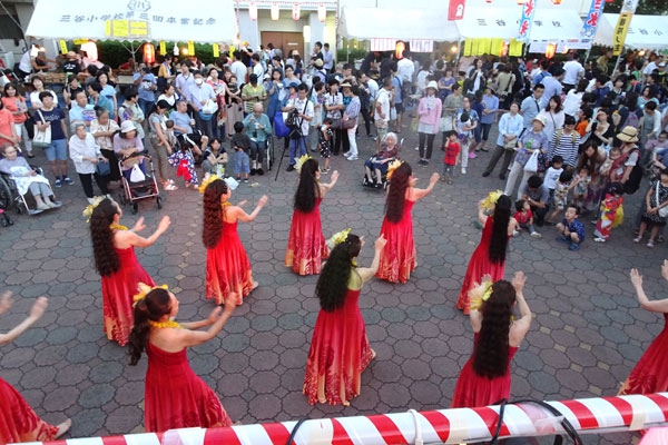 プア ケニケニのみなさんの華麗なフラダンスにつづき、結成15年記念の花太鼓パフォーマンスが会場を圧倒。
