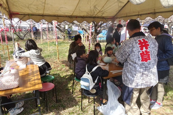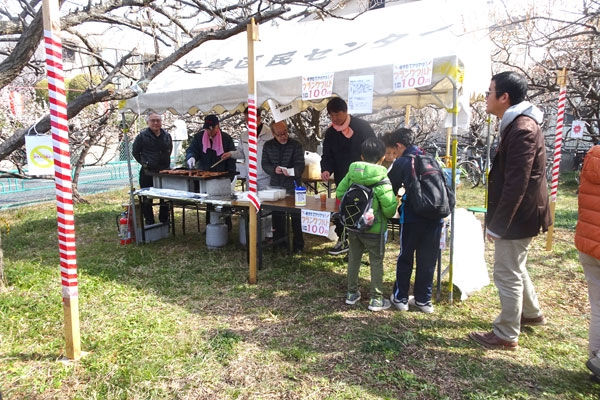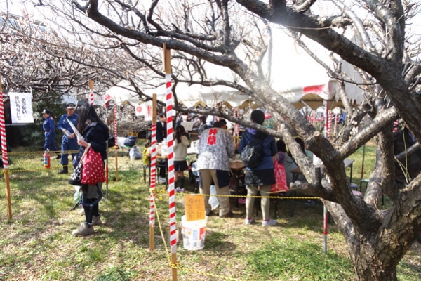 会場の梅林はすでに満開を過ぎたものの、今回も撞きたて餅目当ての大行列が出来ました。