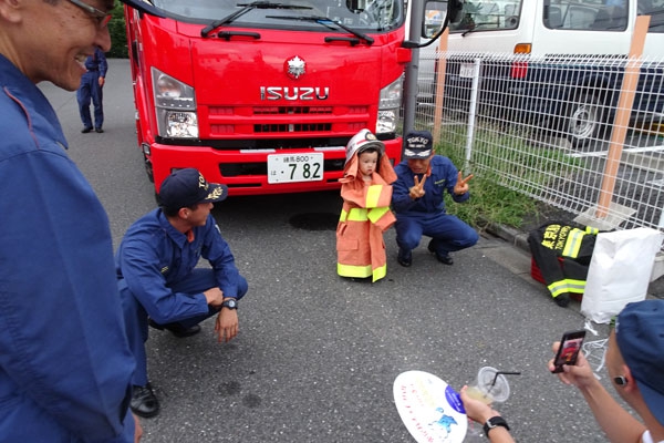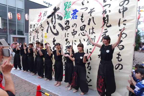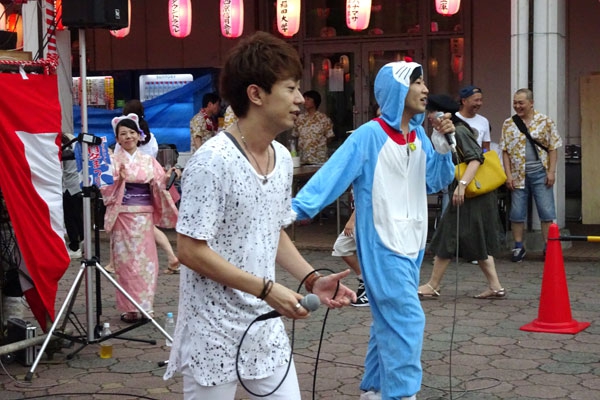 井草高校書道部による流麗なパフォーマンスで幕開け。セレンディピティのお二人の熱唱に続き、花太鼓の撥さばきに会場が盛り上がったところで、お待ちかねの輪踊りの時間となりました。荻窪消防署の消防車を背景にちびっ子たちの記念撮影も。商店街加盟店の売店も終始大人気でした。