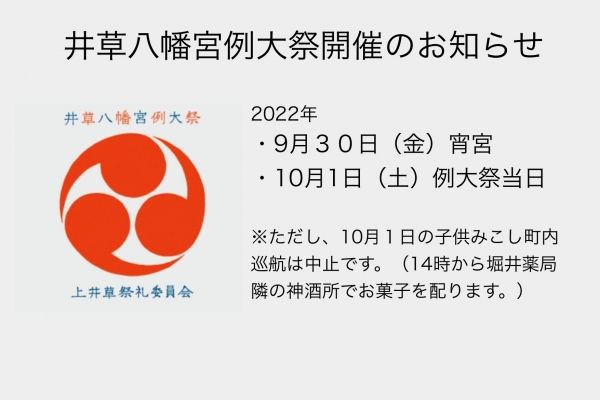 ※ただし、10月1日の子供みこし町内巡航は中止です。(14時から堀井薬局隣の神酒所でお菓子を配ります。)
