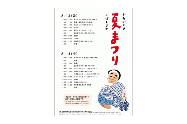※「かみいぐさ夏まつり」の駐車場はございません。お車でのご来場はご遠慮下さい。