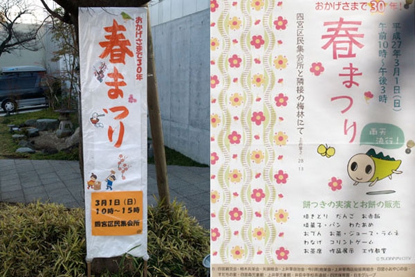 内容:餅つきの実演とお餅の販売、やきとり、だんご、お赤飯、おでん、お茶、ジュース、ラムネ、わなげ、コリントゲーム、お茶席、工作教室