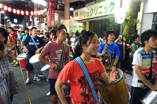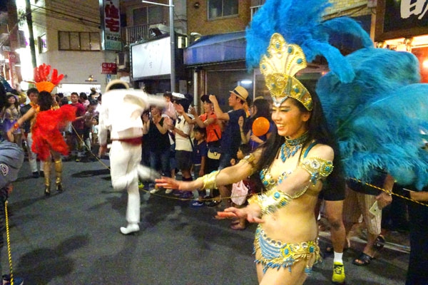上井草駅南口前からスタートしたサンバカーニバルは、群衆の見守る西通りを夏まつり会場の早大ラグビーグラウンドへ。