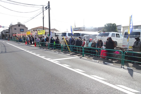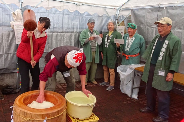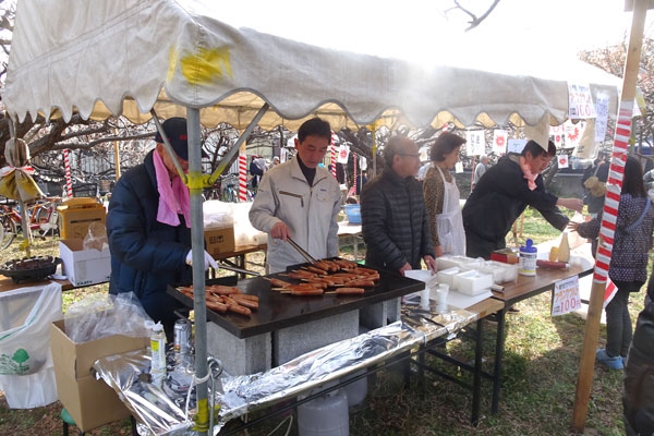 会場の梅林はすでに満開を過ぎたものの、今回も撞きたて餅目当ての大行列が出来ました。