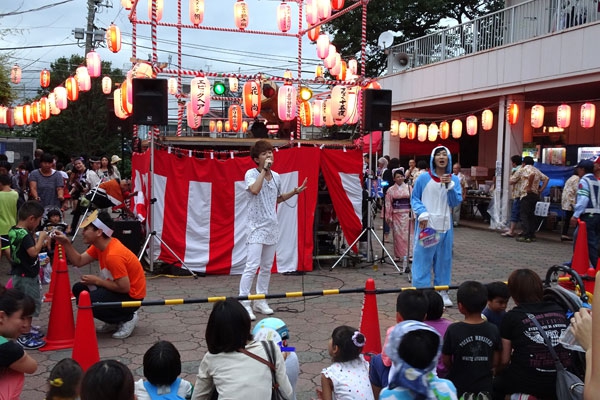 井草高校書道部による流麗なパフォーマンスで幕開け。セレンディピティのお二人の熱唱に続き、花太鼓の撥さばきに会場が盛り上がったところで、お待ちかねの輪踊りの時間となりました。荻窪消防署の消防車を背景にちびっ子たちの記念撮影も。商店街加盟店の売店も終始大人気でした。