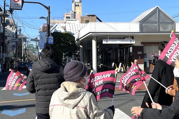 全日本大学ラグビー選手権で、われらが早稲田ラグビー部はみごと準優勝を飾りました。おめでとうございます!決勝戦当日の朝、上井草を出発する監督の先行車と、選手団のバスを人々が見送る光景が見られました。